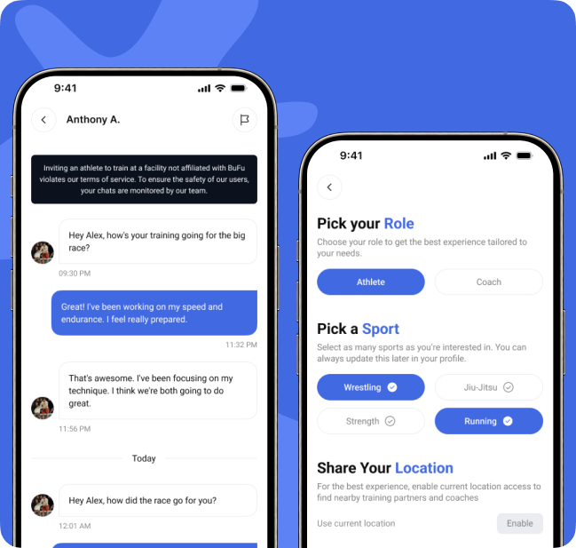 Whether you’re a wrestler, jiu-jitsu fighter, or strength athlete, BuFu makes it easy to find and connect with the right people to elevate your performance. Join our community, match with partners, book verified coaches, and access top training facilities near you.